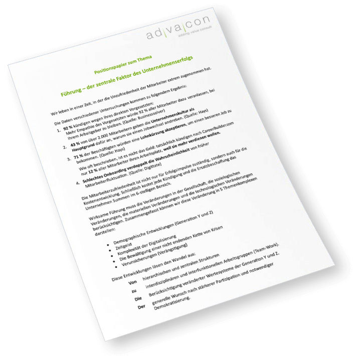 Führungskräfte müssen aktuell die Veränderungen in der Gesellschaft, die soziologischen Veränderungen, die materiellen Veränderungen und die technologischen Veränderungen berücksichtigen. Als zentraler Faktor für den Unternehmenserfolg gilt es für Führungskräfte also die Transformation hin zum digital Leadership zu gestalten. Wie Führung im Kontext dieser Herausforderung gelingen kann? Lesen Sie dazu das aktuelle Positionspapier unseres Geschäftsführers Norbert Müller, welches Sie hier herunterladen können: