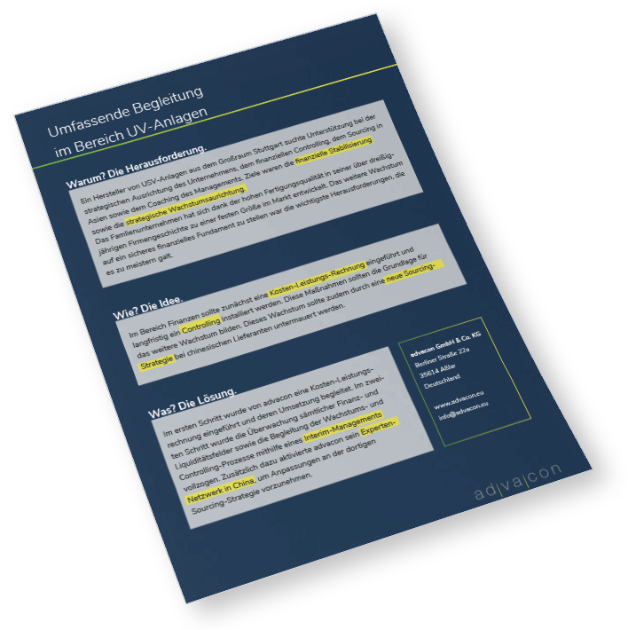 Wir von advacon wissen uns ausschließlich dem Kundennutzen verpflichtet! advacon ist und bleibt ein komplett untypisches Beratungsunternehmen, weil unsere Beratung und unsere Berater:innen anders sind. Anders, weil wir Ihnen Mehrwerte jenseits von Präsentationen und Überschriften bieten. Anders, weil wir selbst jahrelange Erfahrung aus der Industrie mitbringen – aus unterschiedlichsten Branchen und Leitungsfunktionen. Anders, weil bei uns der Kundennutzen im Vordergrund steht und unsere Beratung nachhaltige Ziele verfolgt. Wir sind Experten, wenn es darum geht, Unternehmen über die nächste Schwelle zu bringen.